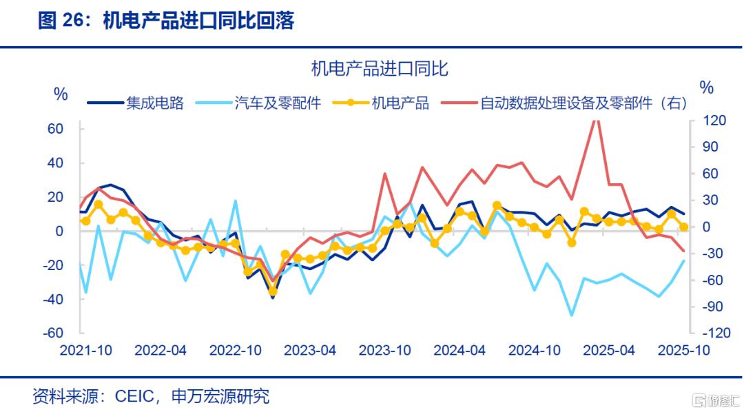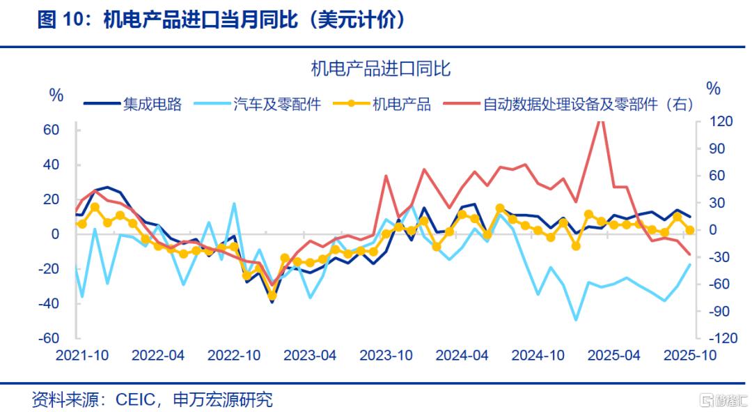 进口方面,加工贸易进口在前月走强的背景下,本月也有明显回落,或亦反映供给对本月外贸数据的扰动。10月进口(美元计价)同比回落6.4pct至1%。其中,加工贸易进口9月大幅上行6.6pct至12%,而10月回落7.3pct至4.6%,也反映供给的扰动较大。从商品层面看,大宗商品如9月进口涨幅较大的原油(-8pct至-0.3%)、大豆(-3.3pct至11.3%)等10月进口也有所回落。机电产品进口增速较上月回落幅度也较大(-7.6pct至2.5%),主要受自动数据处理设备(-15.3pct至-27.2%)及集成电路(-3.8pct至10.2%)所拖累。