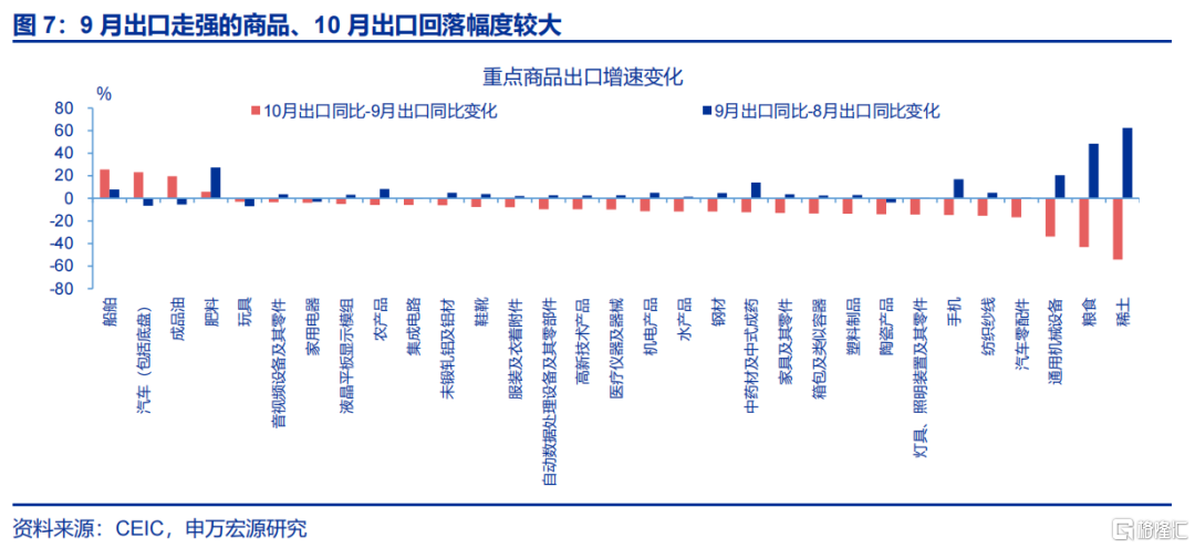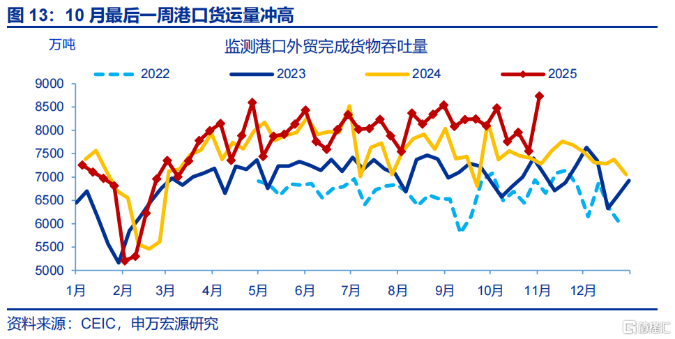出口下滑更深层次原因在于短期供给扰动,或与前期“抢生产”结束以及工作日天数减少有关,高频与商品出口指标均有验证。10月工作日天数仅18天、同比较前月减少3天,考虑到国庆节后一周休假情况也居多,进一步放大了工作日减少对供给的拖累;9月受中秋国庆长假的影响,制造业“抢生产”现象明显,因此带动部分商品在9月集中出口,而10月“抢生产”效应退坡也拖累出口;数据上,10月出口回落的基本上都是9月走强的商品,譬如稀土、粮食、通用设备、手机等增速分别较前月下滑54.2、43.1、33.9、14.7pct。从大类行业看,消费电子、轻工制品等劳动密集型行业出口跌幅更大(-11.1pct至-1.7%),而资本密集型行业中游制造业出口跌幅相对较小(-2.9pct至5.7%);高频指标中,相比港口外贸货运量,10月出口链生产下滑至-0.2%、幅度更大,与10月出口增速(-1.1%)以及PMI数据基本吻合。