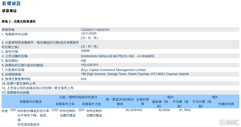 11月6日与11月10日,博裕资本(Boyu Capital Investment Management Limited)接连出手,分别买入复宏汉霖262,500股及80,000股H股,两次增持后其H股好仓比例由5.84%跃升至7%。