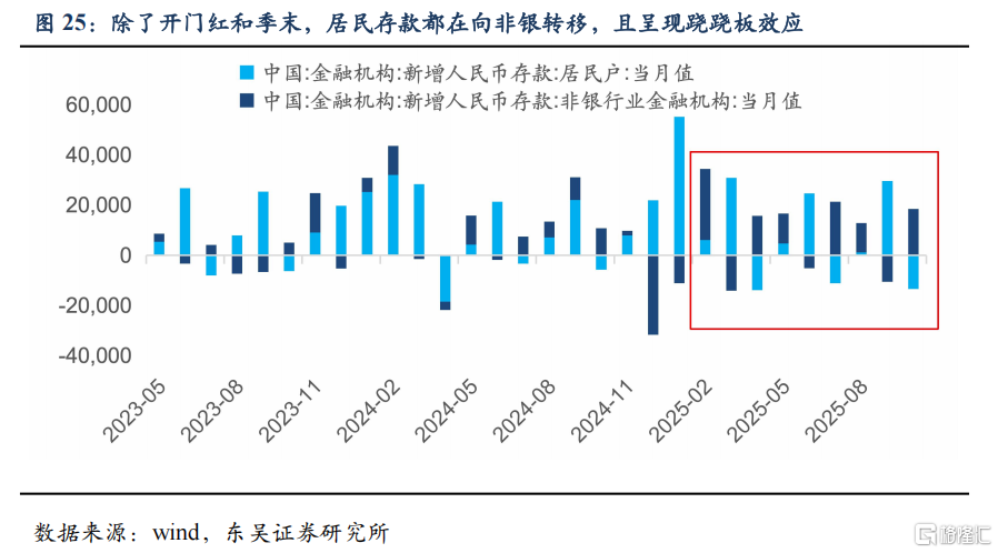 个人投资者方面,已经能看到存款搬家的迹象,低利率环境和资产荒推动居民储蓄向股市转移。2025年1-9月,A 股新增月均开户数224 万,较去年同期(150万)明显提高;两融余额突破历史新高,截至11月17日两融余额2.5万亿元,占A股流通市值比例约2.56%,占成交额比约10.38%,本轮类杠杆资金市值及成交占比相较此前2015年高点(4.73%、22.23%)仍有较大差距。此外,居民存款和非银机构的存款成效此消彼长的跷跷板效应,说明除季末外,居民存款有向非银机构转移的迹象,随着市场赚钱效应加强,2026年,居民“存款搬家”的趋势有可能进一步加速。