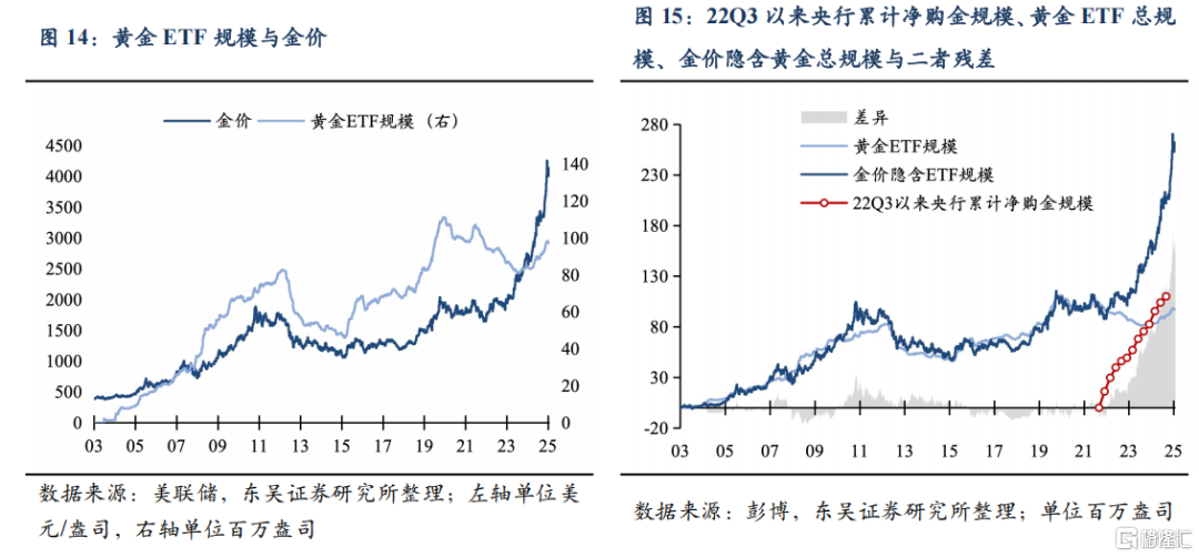 为了定量地论证上述逻辑,我们可以简单测算。具体来看,在实际利率定价黄金的传统框架下,黄金ETF是机构投资者根据实际利率预期交易黄金的载体。从图5可见,自2022Q3以来,黄金ETF规模已与金价出现了显著的偏离,显示推动黄金价格上涨的背后因素不再实际利率预期定价黄金的传统逻辑。进一步地,我们根据2003-2022年黄金ETF与金价的长周期趋势测算出金价“隐含”的EFT规模,再以此倒推二者的偏离程度,可以发现,22Q3以来央行累计净购金规模与“消失”的黄金ETF规模十分接近,即央行购金接替了以ETF投资为载体的机构投资者,成为推动金价上涨重要的边际卖家。而与此同时,2025年以来黄金ETF规模重回上行,反映在当前黄金的历史性牛市中,过往的投机性需求重返市场,与央行购金一同成为今年以来金价上行的短期阶段性助力。