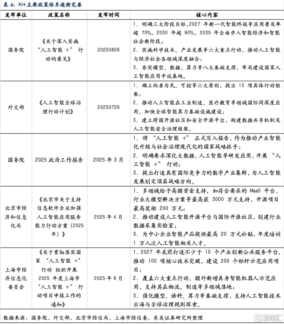 尽管AI产业趋势呈现全球节奏同步性,整体科技板块的上涨节奏也更多依靠海外AI产业链的映射,但2026年以及更长维度来看,中美科技博弈仍将倒逼国内 AI 产业链国产替代加速。“十五五”规划强调科技自立自强,当前中国AI产业政策已经形成了完整体系:《“十四五”数字经济发展规划》(2021年总纲)、《“人工智能+”行动意见》(2025年行动纲领)、《人工智能融合发展行动计划(2025-2028)》(专项计划)及千亿元人工智能创新发展基金(配套机制)共同构成支撑。地方政府积极响应,上海建成全球规模最大城市级5G网络,成都设立“AI应用中试基地”,推动技术向重点行业渗透。集成电路、基础软件等领域获政策重点支持,叠加国内互联网厂商 AI 投入意愿提升,国内AI 产业链从算力硬件到应用端将全面受益。