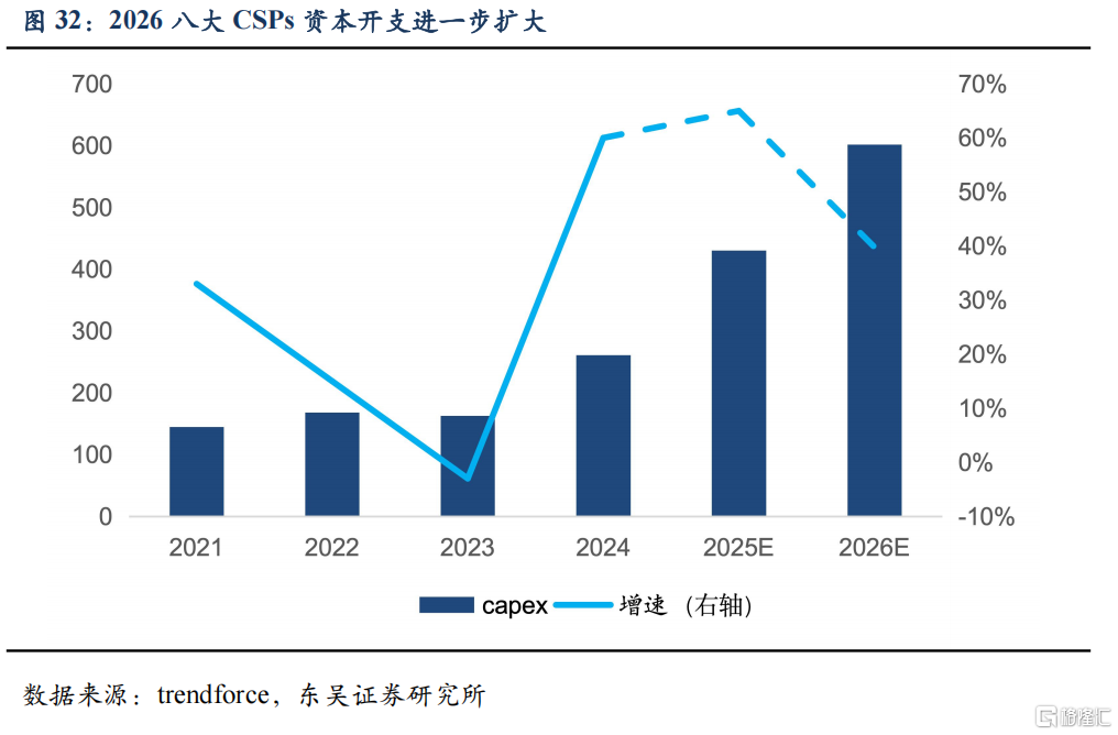 下一阶段,全球在持续加码 AI 基建的同时布局全球AI商业化应用拓宽,2026八大CSPs资本开支进一步扩大。2025年八大CSPs(包含美系Google、AWS、Meta、Microsoft、Oracle以及中系的Tencent、Alibaba、Baidu)的CAPEX总额增速已经被上修至65%。预期2026年CSPs仍将积极投资,资本支出总额可能增加至6,000亿美元以上,年增速有望达到40%,展现出AI基础建设的长期成长潜能。