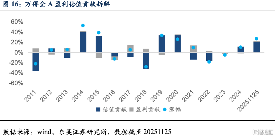 2024年以来,A股市场开始逐步修复。以2024年2月开始计算,至2025年11月14日,万得全A本轮涨幅达73.4%。拆分盈利和估值贡献来看,2024年和2025年明显呈现估值修复的驱动力大于盈利修复的驱动力,类似于上一轮行情中2019-2020年的阶段,均呈现由风险偏好提升带来估值快速修复的行情,而盈利暂未完全兑现。