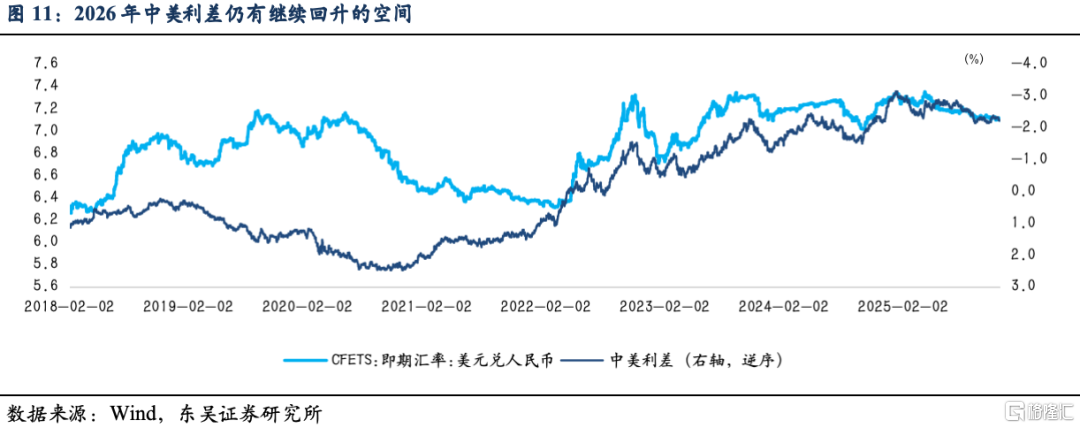 (2)2026年在美元指数保持结构性弱势的情况下,经常项目顺差和证券投资资金净流入或推动人民币对美元升破7.0,若全年继续保持年化波动率3.0%-4.0%,我们预计2026年底人民币对美元或升向6.80;