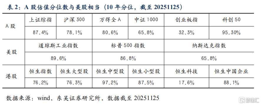 横向比较市场的估值,当前A股估值与美股几乎持平。截至2025年11月25日,上证指数估值从历史96%分位略下降至87.4%,与标普500指数、道琼斯指数相当,沪深300、万得全A略低于美股主要指数。代表科技产业的科创50估值分位已经超过纳斯达克指数。在业绩迎来释放期之前,短期A股部分板块估值偏高,业绩真空期内仍需要消化部分板块的估值。在业绩释放、估值与业绩逐步匹配后,市场有望在年报披露完毕后再迎来新一轮的估值业绩平衡。