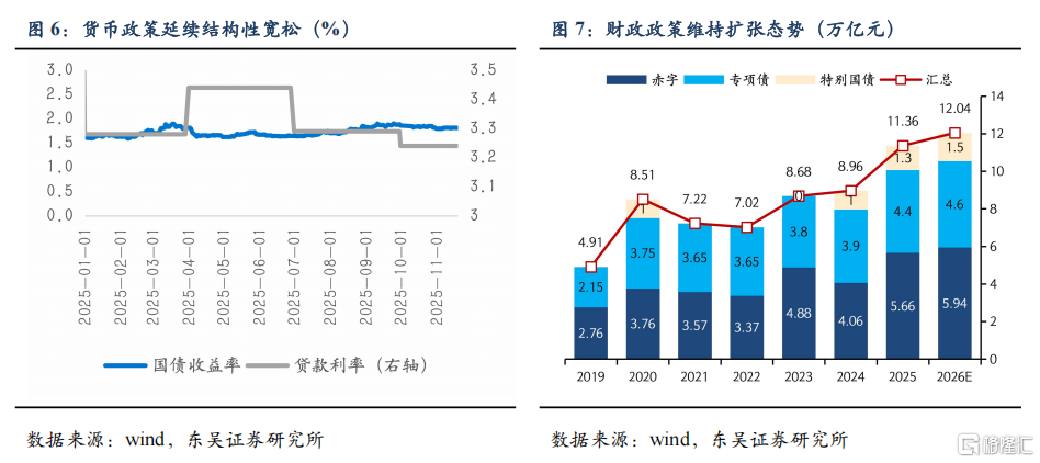 政策层面,长期来看,“十五五”接力“十四五”,对长维度的经济增长和转型提出了新的要求。“十五五”规划建议已于2025年10月发布,“十五五”纲要有望在2026 年两会期间正式出台。与“十四五”相比,“十五五”建议新增“科技自立自强水平大幅提高”的发展目标,12个重点任务领域虽基本一致,但现代产业体系、对外开放、社会民生三个主题排序更靠前,绿色发展排序略靠后,凸显了产业升级和民生保障的重要性。短期来看,2026年,财政增量资金预计比2025年多6200亿,延续积极扩张态势。其中超长期特别国债规模或增加2000亿,专项债全年额度或增加2000亿,赤字率稳定在4%左右,赤字规模增加2200亿。2024-2026年赤字、超长期特别国债、专项债规模均呈上升趋势,财政政策将持续引领内需扩张。货币政策方面,结构性宽松延续。2023年以来贷款利率整体呈下降趋势,2025年最新房贷利率已下降至3.24%,综合利率则相对平稳。2026年,货币政策有望继续通过结构性工具引导资金流向科技创新产业和需要支持的关键领域,宽松的货币环境将为实体经济、资本市场提供流动性支持。
