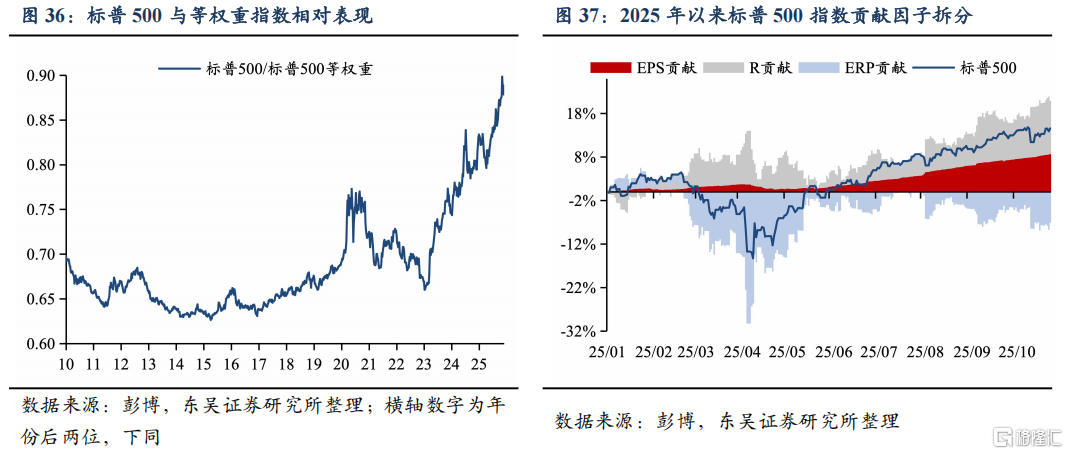 回顾看,支撑美股抵御政策不确定性冲击、延续牛市的基础,仍是AI产业叙事下大型科技股的盈利增长与估值提升。表现在股指上,标普500与其等权重指数之比在今年以来继续攀升至历史新高。进一步拆分标普500指数的贡献因子可见,年迄今标普500指数累计上涨14%,其中盈利预期EPS和估值PE分别贡献11.21%和2.51%。今年尤其是下半年以来,盈利预期的增长是美股上涨的主要贡献,而降息及降息预期对估值的提振在一定程度上被风险溢价的上行所抵消,尤其是4月初对等关税落地、四季度政府关门持续、以及近期AI泡沫担忧升温时期。