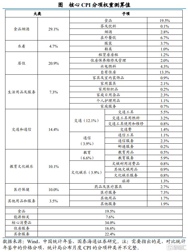 在此前专题报告《中国的核心通胀:压力多少?》中,我们曾对核心CPI中分项权重的拆分方法做过系统说明。结合最新的居民消费支出结构统计,我们发现部分品类权重已发生变化,比如自有住房折算租金与食品权重趋于增加;而衣着占比继续下降、教育文化娱乐权重边际回落。