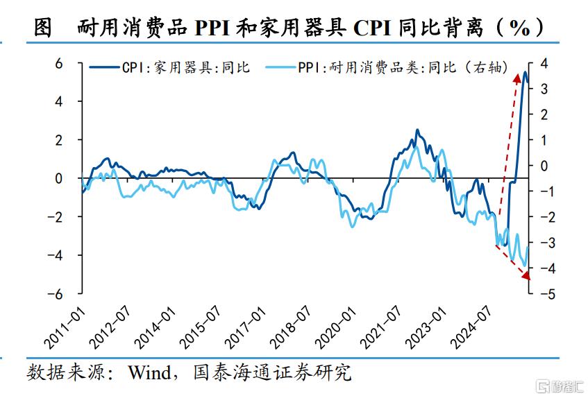 2)财政补贴阶段性抬升部分耐用品价格。按照国家统计局规定,CPI中执行政府以旧换新的商品采集的仍是原价。财政补贴在促进销量的同时,也撬动了“同预算下的消费升级”,带动平均成交单价上行。受此影响,今年以来家用器具、通信及交通工具等价格表现显著优于季节性规律。更为关键的是,这与上游耐用消费品PPI的表现形成了鲜明背离,进一步印证了补贴带来的需求改善尚不足以扭转上游生产端的降价压力。