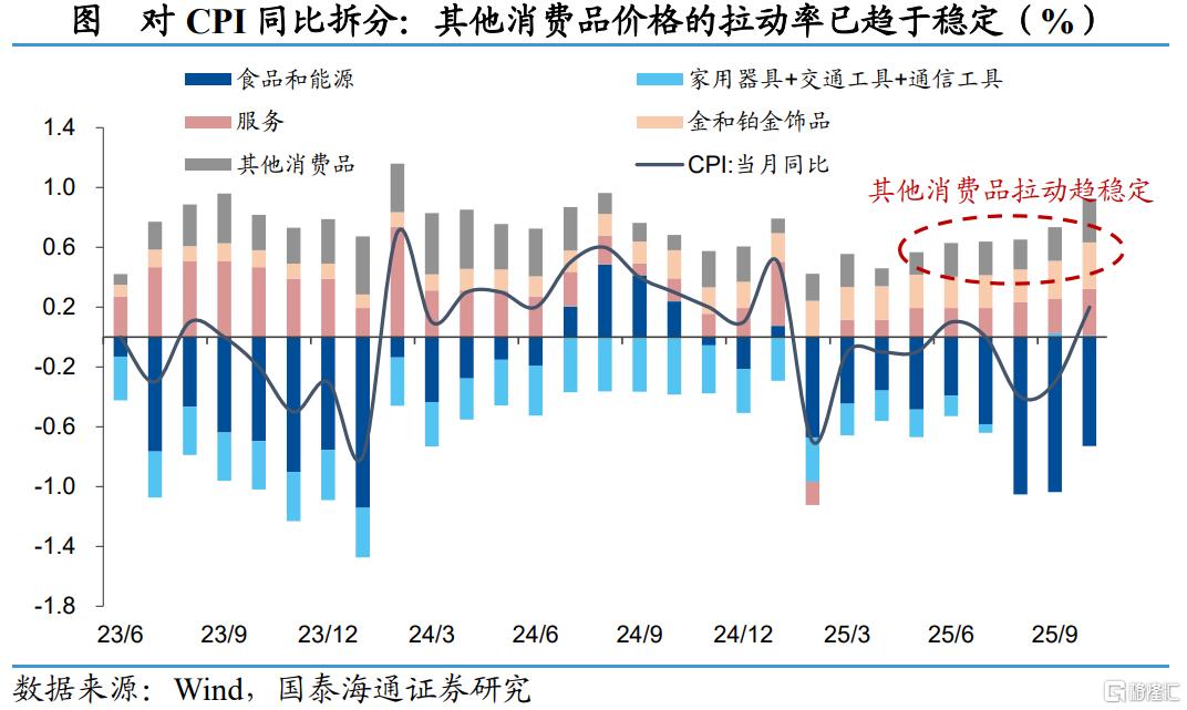 1)国际金价推升金饰类价格。国际金价连创新高,金饰、铂金饰全面跟涨,叠加国内居民“购金潮”带动销量,金饰品子项对CPI的同比拉动已升至0.3个百分点,2025年以来月均的拉动都超过0.2个百分点。需要强调的是,金价飙升更多是避险需求和美元信用的影响。