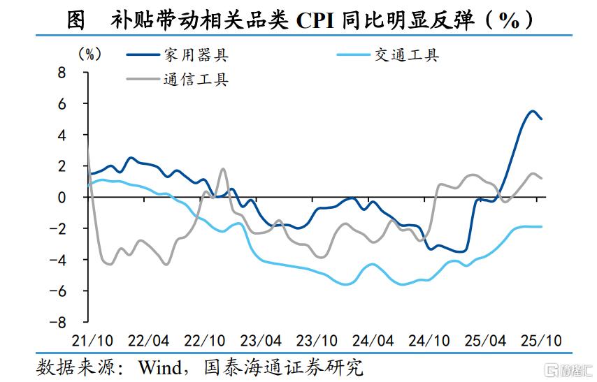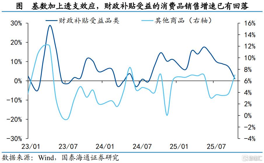 但需要关注的是,财政补贴撬动价格的“乘数效应”或面临边际走低压力:一方面,耐用品具有低频消费特征,今年的集中置换可能对明年需求形成一定透支。且随着今年补贴政策显效,2026年相关品类的价格和销量将面临更高的基数,显著拉低同比贡献。实际上,这一边际减弱的迹象在今年四季度已初现端倪。
