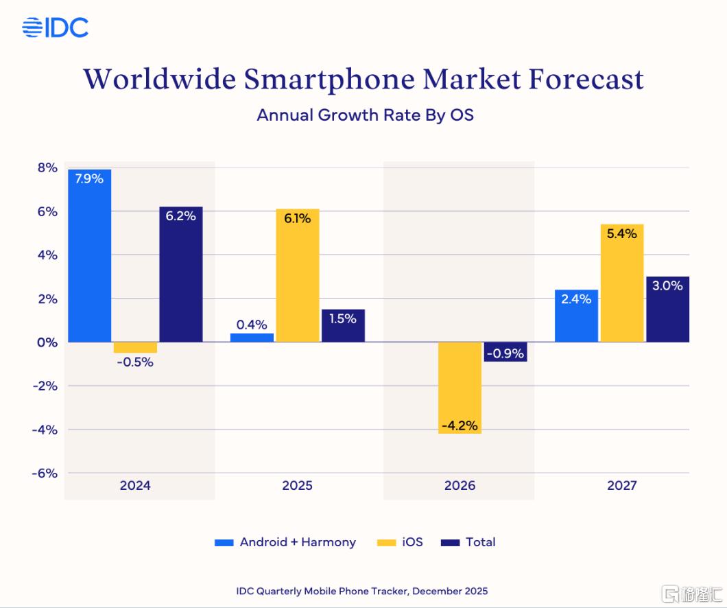 由于零部件短缺和产品周期调整的综合影响,IDC将2026年全球智能手机出货量的增长预测从增长1.2%下调至同比下降0.9%。