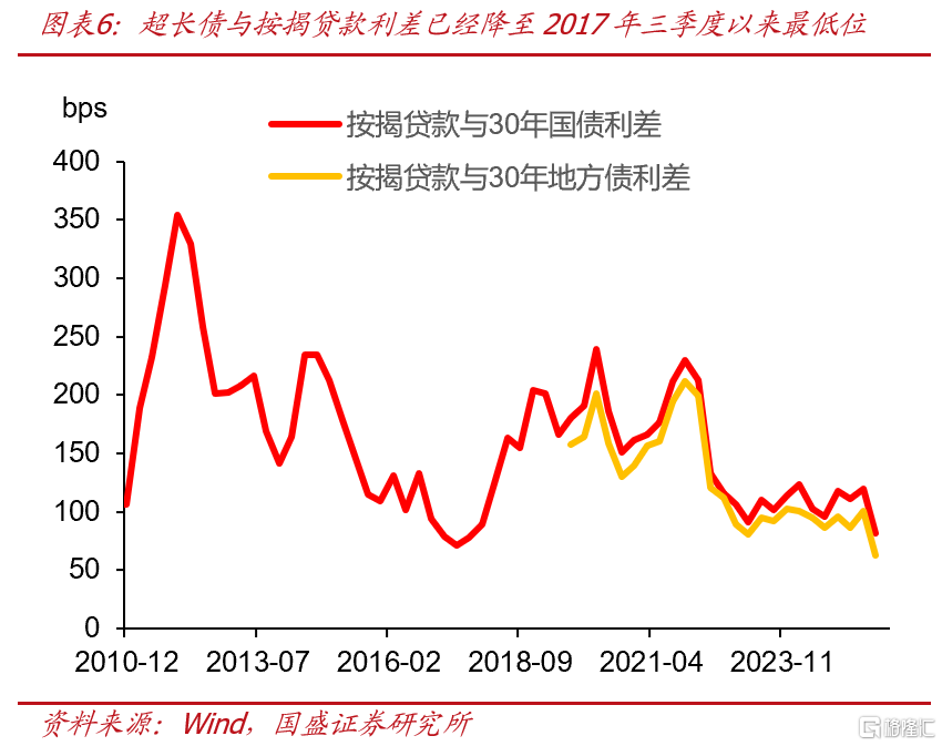 另一方面,从绝对收益的角度来看,超长债利率的上升会提升其相对于其他资产的吸引力。目前超长债利率与同期限贷款等资产相比,吸引力已经明显提升。当前30年国债与个人住房贷款利率的利差仅有81bps,是2017年三季度以来的最低水平,30年地方债与个人住房贷款的利差更是仅有63bps,考虑到税收、不良和资本占用等优势,债券性价高于贷款。同时,目前超长债收益率也能够有效的覆盖保险、银行等负债成本。考虑到随着地产销售放缓,居民储蓄或更多进入到广义固定收益金融资产,因而后续居民存款、保险保费等收入依然会再度提升,这意味着负债端也并非配置机构的配置约束。