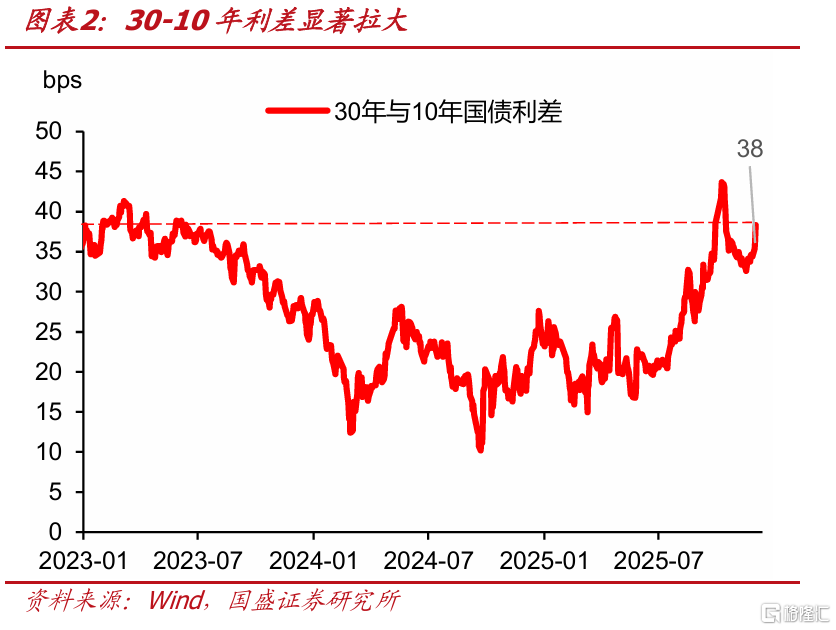 近期超长债在其他债券表现相对平稳情况下,出现明显下跌行情。上周五以来,中短债基本保持平稳,2年、5年等国债利率波动不足1bps,10年国债也近微幅上行1.1bps,但30年国债大幅上升5.0bps,50年国债更是大幅上行5.9bps。这导致超长债利差大幅度上行,30年与10年利差拉大到38.3bps,再度接近9月底和10月初的高点。