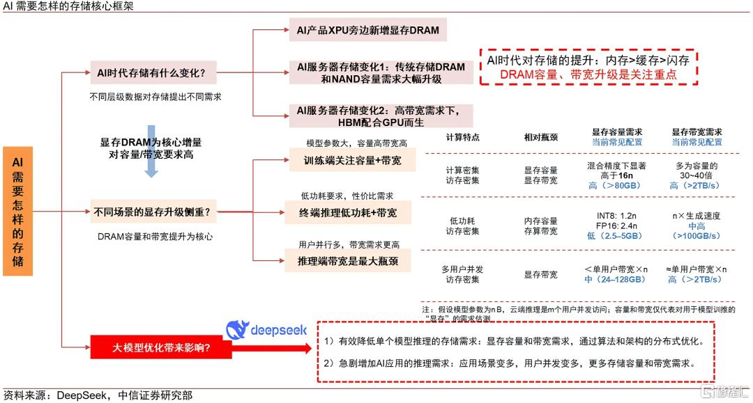 本报告为AI存储系列报告第一篇,从“AI时代需要什么样的存储”进行阐述分析和展望,供相关产业投资人参考。中信证券认为,AI时代显存带宽和容量升级为核心,存算一体是趋势,近存计算高景气,看好投资机遇。其中,HBM有望成为云端训推的标准化主流显存方案;在美国对华制裁加码背景下,国内存储厂商加速突破追赶,相关产业链配套具备重要投资机会。此外,CUBE有望在推理/端侧成为“打破AI存储墙”的弯道超车补充路径,通过定制化+先进封装获得突破性带宽,并以封装技术弥补制程短板,是当前国内满足AI存力需求的优选方案,也是未来本土存算一体实现弯道超车的重点观察方向,为真正意义上的存算一体奠定基础。