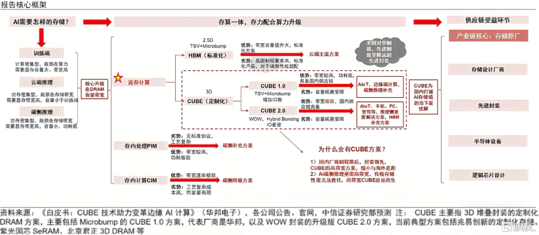 AI时代显存带宽和容量升级为核心,存算一体是趋势,近存计算高景气,看好投资机遇。围绕国内HBM及CUBE相关产业链,中信证券重点推荐四个方向:
