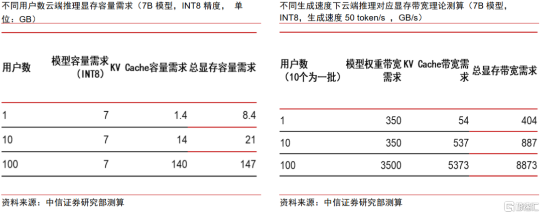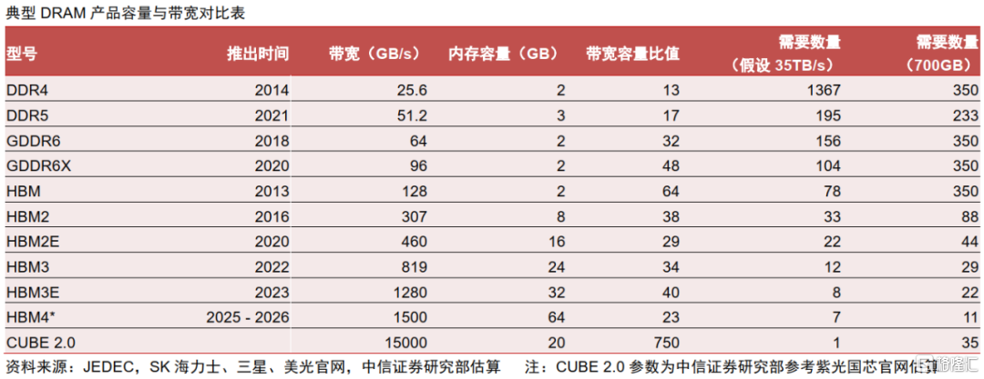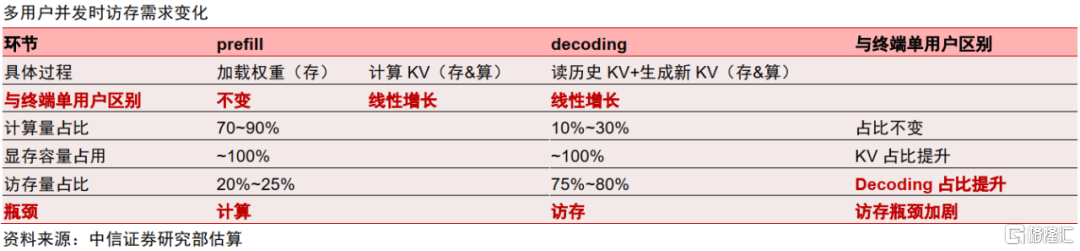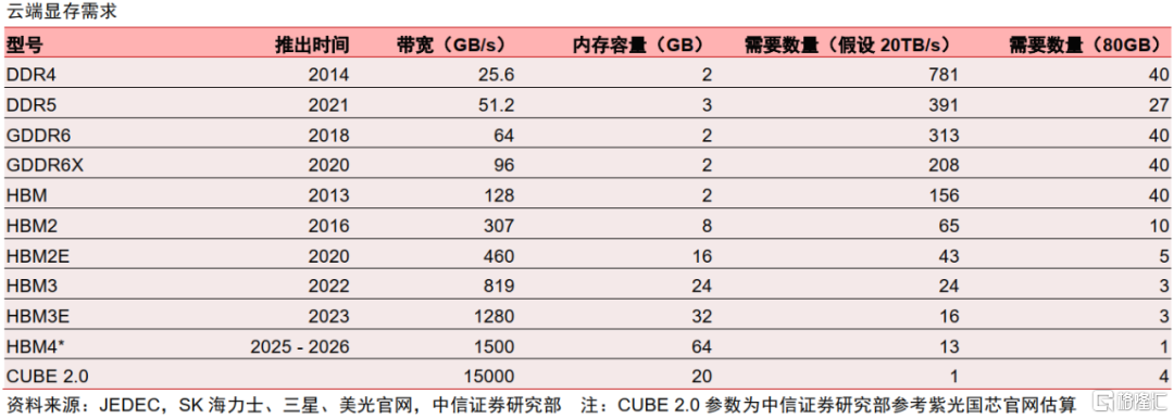 2)云端推理:访存密集型,多用户并发下访存瓶颈加剧,显存带宽、容量要求均急剧增长,带宽需求提升倍数更大,为核心升级需求。m个用户并发,适当采用批处理,则云端推理带宽需求是端侧推理的m倍,容量提升倍数低于带宽,功耗要求较端侧宽松。产品选择上,HBM为主,GDDR/CUBE 2.0等为补充,PD分离趋势下非HBM显存方案渗透率或有提升。