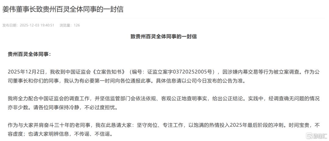 为安抚内外,姜伟通过贵州百灵官方公众号,发表了一篇公开信。他在信中表示,自己将全力配合证监会的调查,“实践中,经调查确无问题的情况亦非少数。”他希望公司内部保持冷静,不必过度担忧,坚守岗位、专注工作,全力投入2025年最后的冲刺阶段。