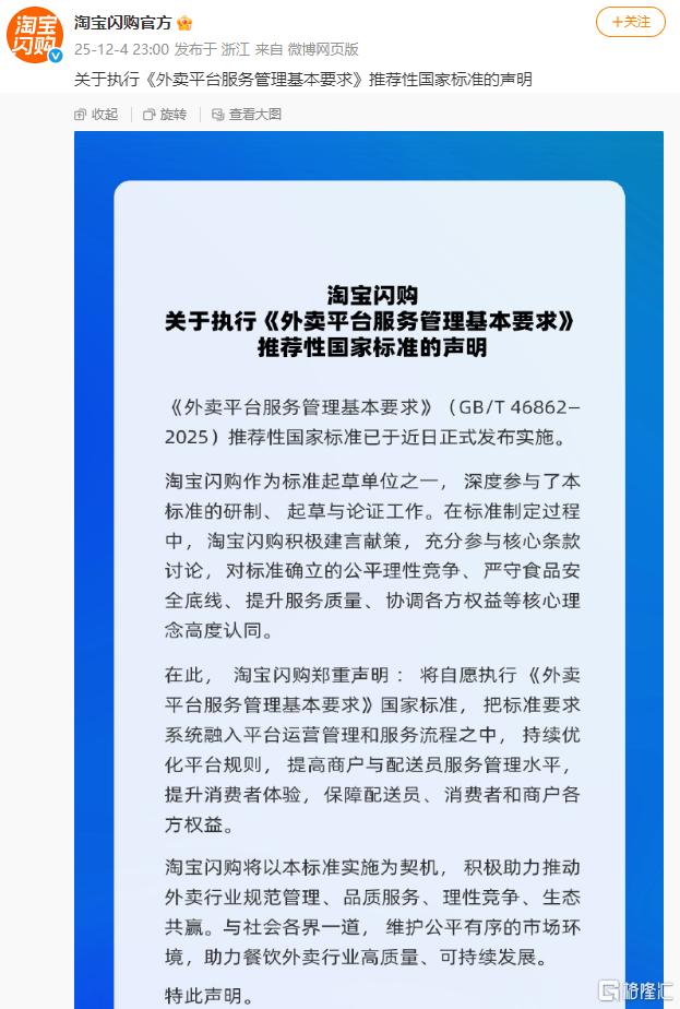 12月4日,淘宝闪购发文表示,将自愿执行《外卖平台服务管理基本要求》国家标准,把标准要求系统融入平台运营管理和服务流程之中,持续优化平台规则,提高商户与配送员服务管理水平,提升消费者体验,保障配送员、消费者和商户各方权益。淘宝闪购将以本标准实施为契机,积极助力推动外卖行业规范管理、品质服务、理性竞争、生态共赢。与社会各界一道,维护公平有序的市场环境,助力餐饮外卖行业高质量、可持续发展。