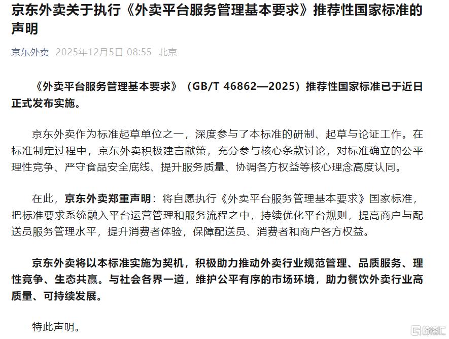 12月5日,京东外卖表示,将自愿执行《外卖平台服务管理基本要求》国家标准,把标准要求系统融入平台运营管理和服务流程之中,持续优化平台规则,提高商户与配送员服务管理水平,提升消费者体验,保障配送员、消费者和商户各方权益。