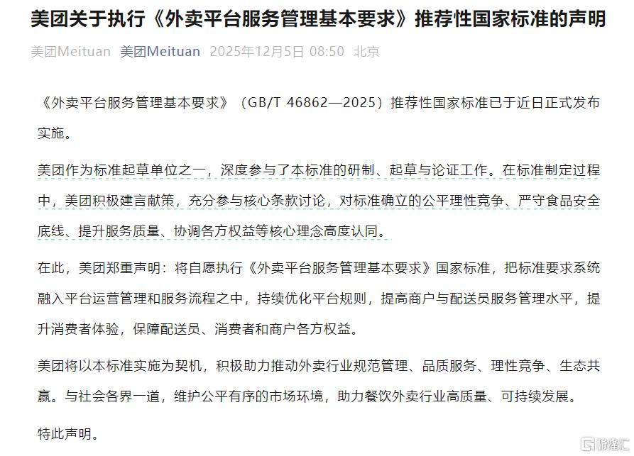 12月5日,美团Meituan发文表示,将自愿执行《外卖平台服务管理基本要求》国家标准,把标准要求系统融入平台运营管理和服务流程之中,持续优化平台规则,提高商户与配送员服务管理水平,提升消费者体验,保障配送员、消费者和商户各方权益。美团将以本标准实施为契机,积极助力推动外卖行业规范管理、品质服务、理性竞争、生态共赢。与社会各界一道,维护公平有序的市场环境,助力餐饮外卖行业高质量、可持续发展。