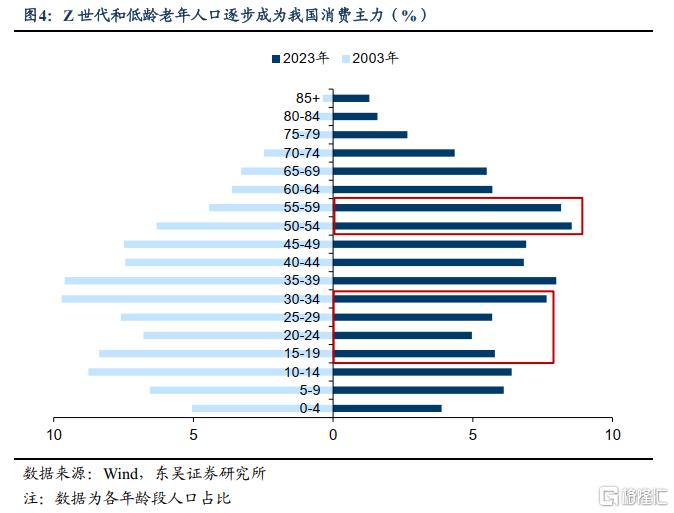 从低龄老年群体的角度来看,截至2023年,我国人口结构中占比最高的人群是50-54岁和55-59岁两个层级,分别占到我国全部人口的8.5%和8.2%,这部分人口将是未来十年我国低龄老年人口的主力组成部分。从消费理念来看,其一,根据中国人民银行《2019年中国城镇居民家庭资产负债情况调查》的数据,户主年龄在46岁-55岁和56岁-65岁两个年龄段的家庭户均总资产相对更高且家庭负债参与率相对更低,叠加目前我国家庭结构小型化的趋势,低龄老年群体的消费理念更加开放,其消费理念正经历由“节俭至上、稳定保守”向“品质至上、开放探索”的转变;其二,根据马斯洛需求层次理论,我国老年群体在生理需求和安全需求方面已经得到了充分满足,目前对于社交需求和自我实现需求的诉求不断提升,这个转变体现在我国老年群体在文化娱乐、老年教育以及旅游出行等方面的消费支出不断提高。与Z世代人口相类似,低龄老年群体在消费中也更加关注情感与情绪上的满足,这种代际交替与人口结构变化下消费理念的转变,正在深刻重塑中国消费市场的底层逻辑,成为新消费持续演进的根本动力。