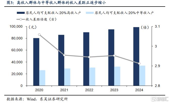 一方面,我国中等收入群体规模不断增加,收入结构的优化为消费增长提供了持续动力。在共同富裕政策方针的指引下,我国居民收入结构持续优化升级,收入分配格局正从“金字塔型”向“橄榄型”迈进。截至2025年我国中等收入人口已经超过4亿人,根据商务部的预测数据,2035年我国中等收入人口将超过8亿人,而与此同时,我国中等收入人口与高收入人口的收入差距也在逐步缩小,2024年我国20%高收入户人均可支配收入是20%中等收入户人均可支配收入的2.9倍,自2020年以来持续收窄,中等收入人口规模的加速增长以及收入的平稳增长将为我国消费市场的扩容提供重要助力。