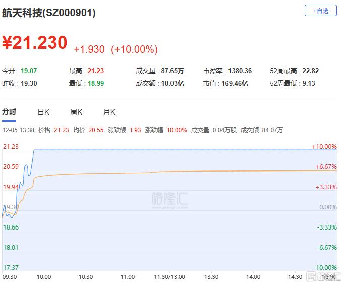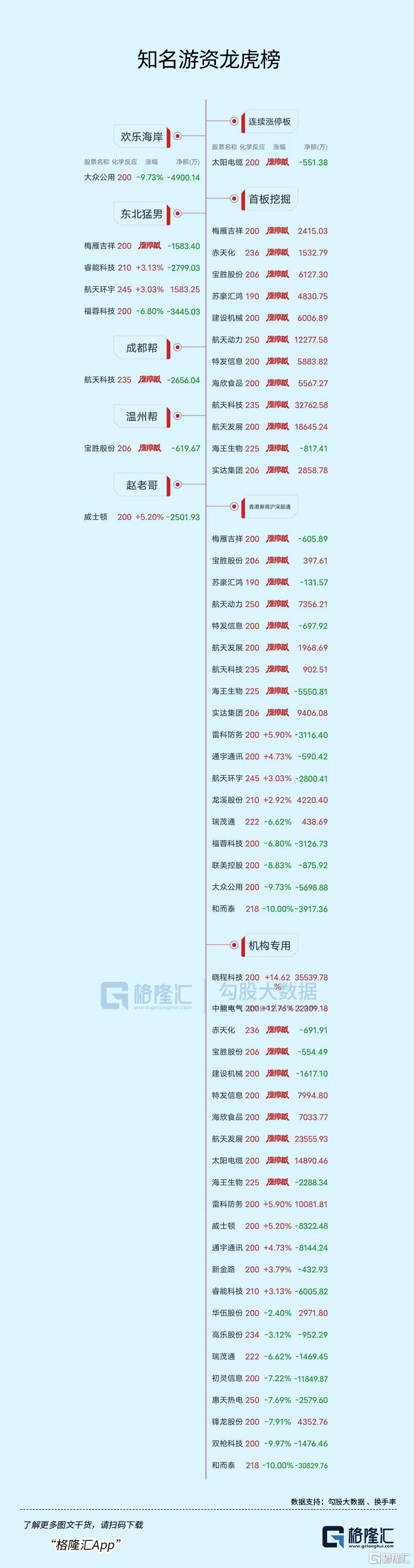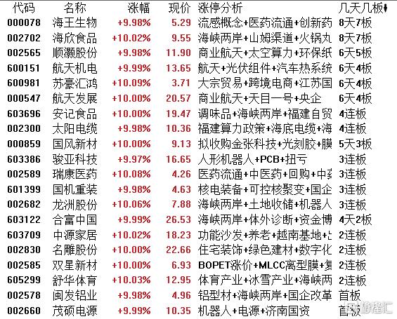 高位股方面,海王生物、海欣食品8天7板,顺灏股份6天5板,航天机电、苏豪汇鸿、航天发展6天4板,太阳电缆与安记食品4连板;国风新材5天3板,骏亚科技、瑞康医药、国机重装等3连板。