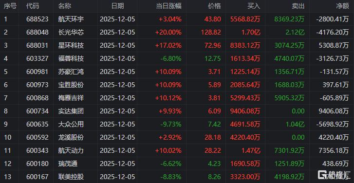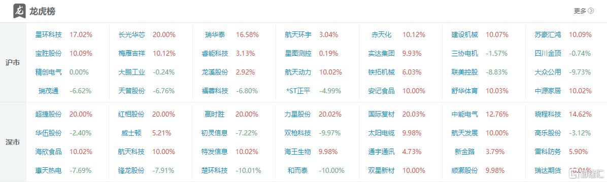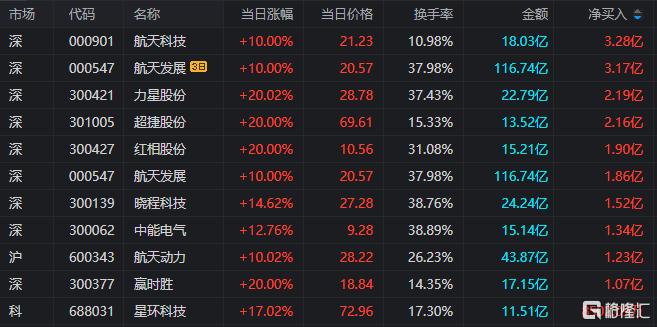 龙虎榜单日净买入额前三为航天科技、力星股份、超捷股份,分别为3.28亿元、2.19亿元、2.16亿元。