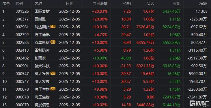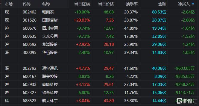 龙虎榜单日净卖出额前三为和而泰、国际复材、四川金顶,分别为2.64亿元、2.00亿元、1.64亿元。