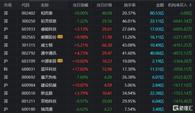 龙虎榜中涉及机构专用席位的个股中,当日净卖出额前三为和而泰、初灵信息、睿能科技,分别为3.08亿元、6641.34万元、6005.82万元。