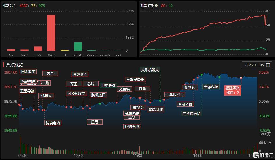 12月5日,沪深两市成交额1.73万亿,较上一个交易日放量1768亿。板块方面,保险、贵金属、福建、商业航天、CPO等板块涨幅居前,银行、中药、影视院线等板块跌幅居前。