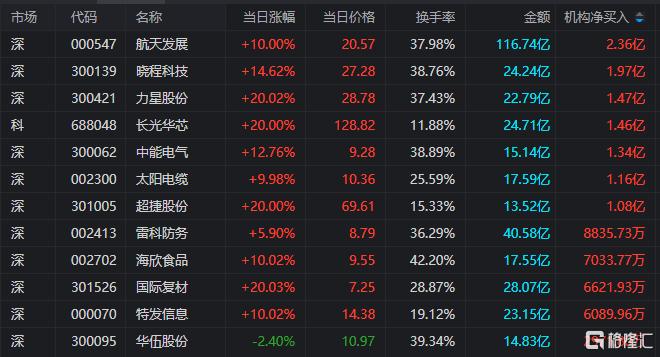 龙虎榜中涉及机构专用席位的个股中,当日净买入额前三为航天发展、晓程科技、力星股份,分别为2.36亿元、1.97亿元、1.47亿元。