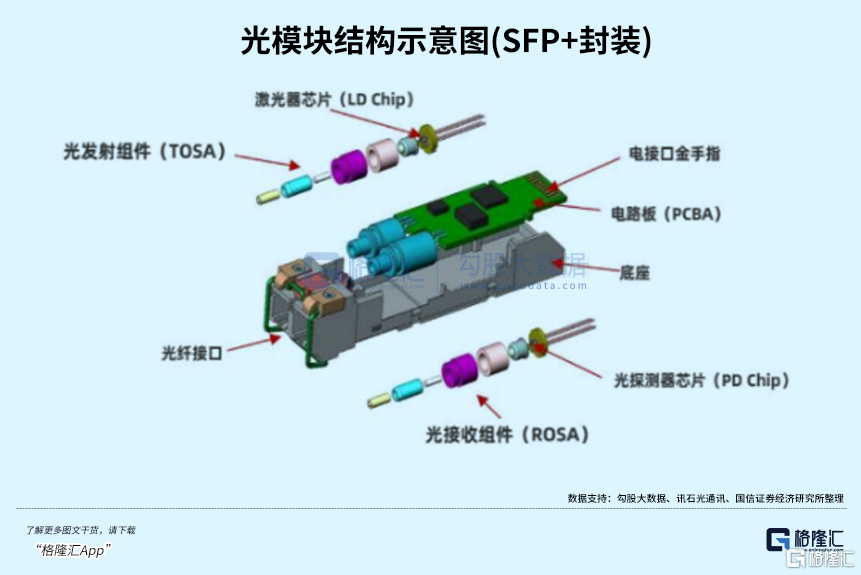尽管价值占比不如GPU\ASIC\HBM般大,激光器芯片是光模块实现光电转换功能的核心组件。在技术架构上,发射端的激光器芯片(如DFB、EML)将电信号转化为光信号,接收端的探测器芯片则完成逆向转换,两者性能直接影响光模块的传输质量,价值量在高端光模块中占据重要比例。