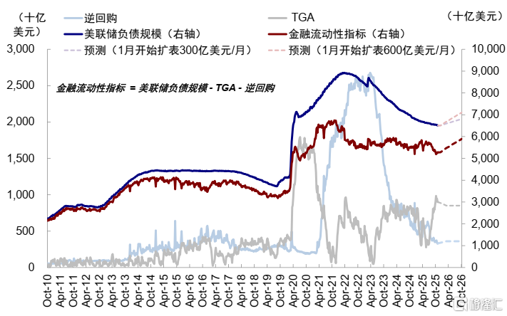 除了上文讨论的降息路径带来的“价”的变化,“量”的方面金融流动性的改善方向也是确定的。11月初回购市场一度流动性紧张,市场对流动性产生担忧。12月美联储已开始停止缩表,加上政府关门结束,意味着对金融流动性的挤压已经结束,如果后续还重启扩表的话,有望释放更多流动性。