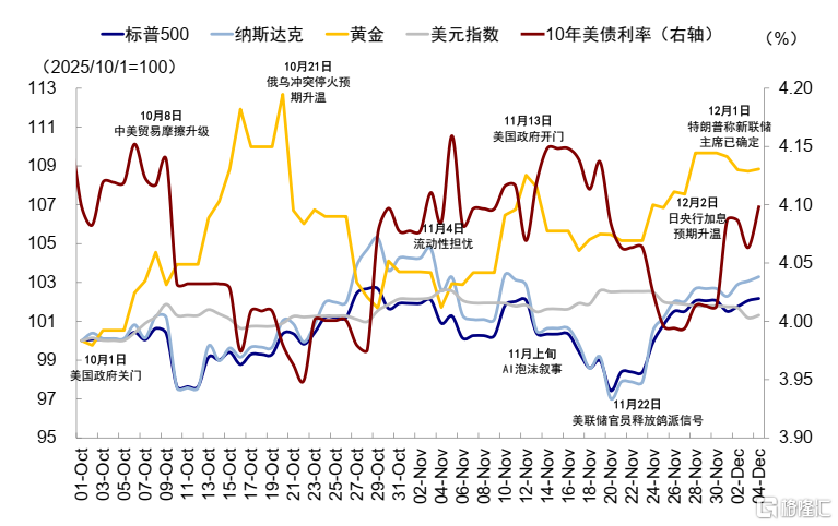 回顾过去一段时间,降息预期一直在反复摇摆,也成为影响资产走势的关键变量。1)10月FOMC鹰派降息打压降息预期,加上美国政府关门期间非农和CPI等重要经济数据缺失,12月降息概率一度降至11月19日30%的低点,叠加回购市场流动性紧张和AI泡沫担忧,各类资产普跌,尤其是科技股,美元则在11月21日站上100.4的近几月高位。2)11月下旬后,美联储理事Waller、旧金山联储Daly等官员接连“放鸽”,叠加近期特朗普暗示哈塞特或是美联储新主席、哈塞特表示12月应降息,12月降息预期再度升温,美股和黄金反弹,美元则下探至99以下。
