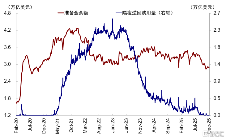 ► 除美联储扩表外,财政部TGA的消耗也有助于释放流动性。此前因债务上限解决后财政部发债,叠加政府关门期间部分支出受影响,TGA从6月的2608亿美元一度升至10月的近1万亿美元,抽离了流动性。但11月13日政府重新开门,各项支出恢复正常后,TGA账户已回落至当前的9085亿美元。我们预计后续TGA账户还有望继续回落至美国财政部的目标额8500亿美元附近,释放更多流动性。历史经验表明,ONRRP和TGA呈负相关关系,过去5年相关系数为-0.57。此前TGA账户的回补也伴随ONRRP使用量消耗至接近于零,难以对冲之前缩表压力。我们预计,伴随TGA回落,ONRRP有望小幅抬升,继续发挥“蓄水池”的作用。