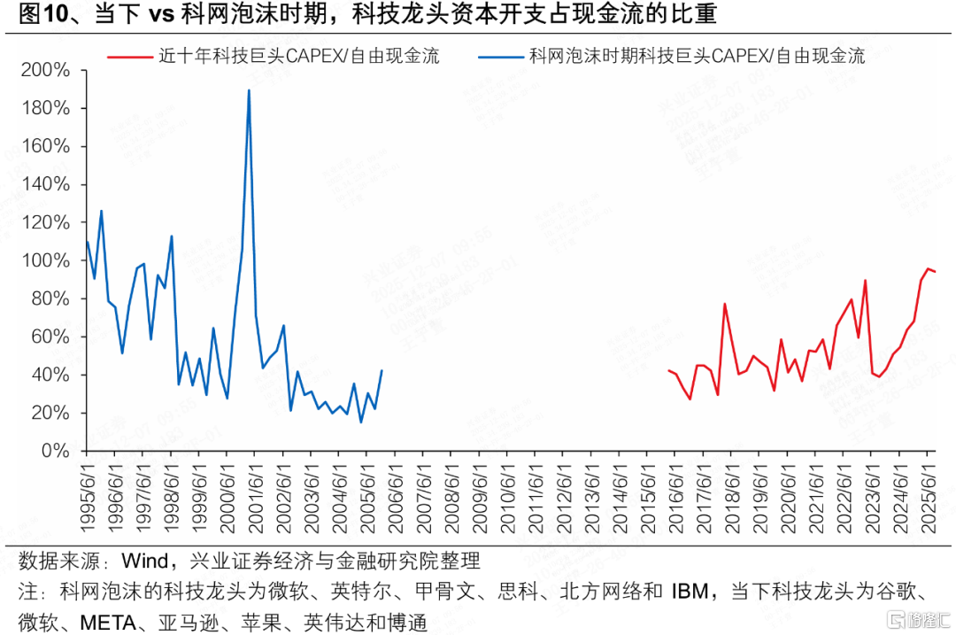 此外,尽管近期科技巨头通过举债融资的方式以扩大资本开支引发市场对持续性的担忧,但科技公司充裕的自由现金流和经营性现金流仍可以覆盖资本开支。并且,对比当下和90年代来看,当下的AI科技龙头CAPEX占自由现金流和经营性现金流的比重也明显低于科网泡沫时期。