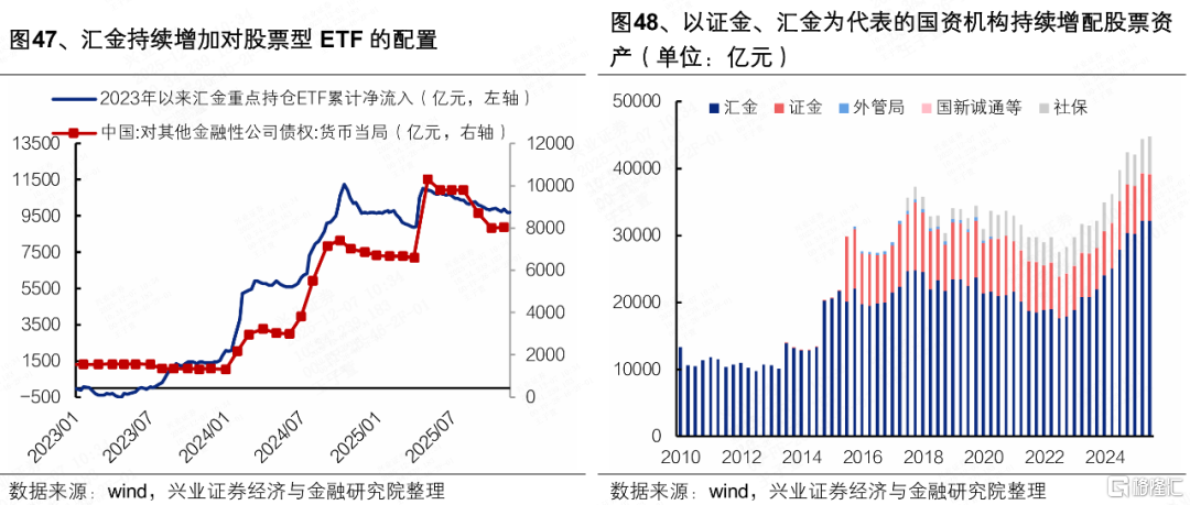 随着证金、汇金等国资机构近年来对权益资产的配置持续增加,当前已成为股票ETF的重要持有人,同时根据前十大股东口径统计的汇金、证金等国资机构直接持有股票市值也已超过4.6万亿。截至25H1,根据已披露的股票型ETF持有人信息,随着上半年证金、汇金大量增持ETF维稳市场,其持有比例从24年末的33.0%进一步提升至25H1的37.2%,接近1.3万亿,已成为股票ETF的重要持有人;从持股情况看,根据前十大股东口径统计,截至25Q3汇金、证金等国资机构持股市值也已超过4.6万亿。