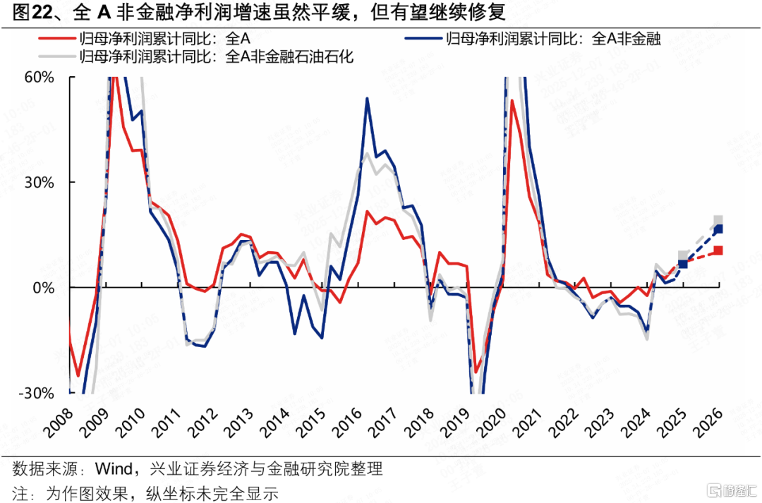从强预期到强现实,2026年全A非金融净利润增速有望回到两位数。依据当前个股的Wind一致预期,并按行业调整系数,兴业证券预测明年全A盈利增速有望继续平稳向上,全A非金融25年底在低基数效应下,净利润增速有望达到6.5%,2026年全年净利润增速有望达到16.5%。伴随着全A盈利的回暖,高景气行业占比也有望进一步提升。