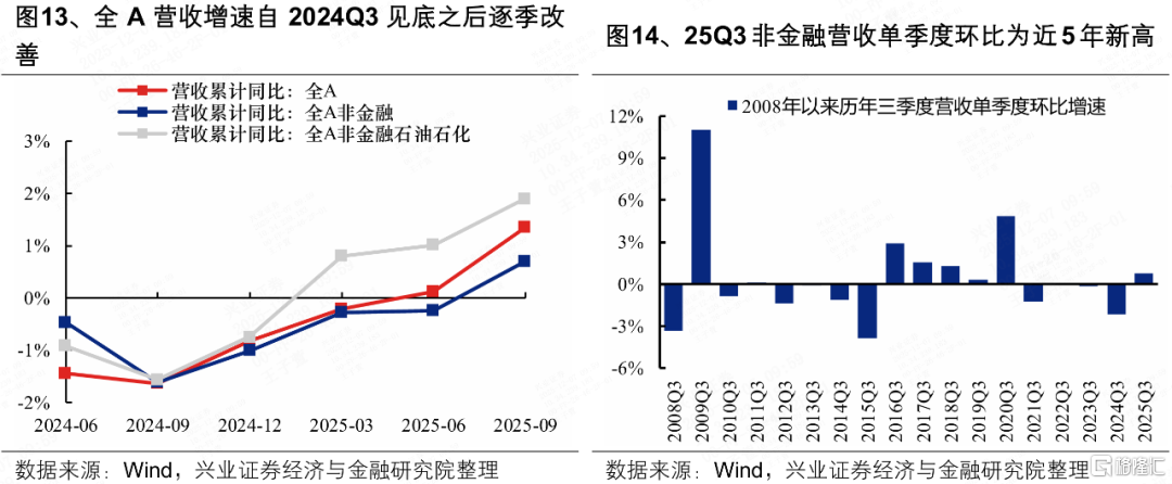 今年以来全A盈利逐季修复,好于市场预期。全A非金融营收增速自2024Q3见底之后,逐季改善,于2025Q2转正以后持续上行,2025Q3累计营收同比增速达到0.70%;此外,2025Q3单季度营收环比增速为0.77%,亦是2021年以来的首次转正,5年新高,2008年以来的70.5%的中等偏高分位。