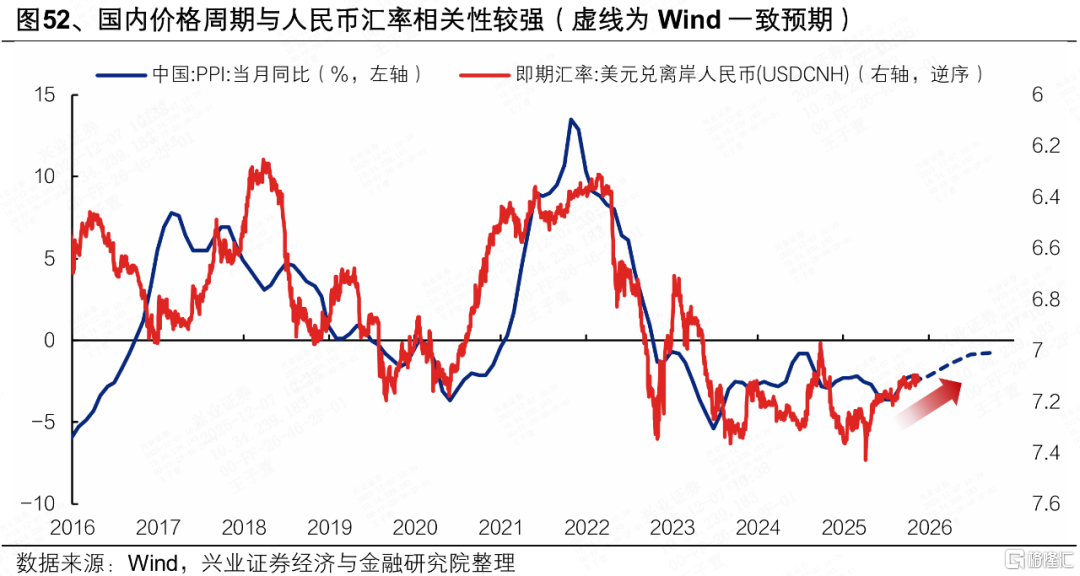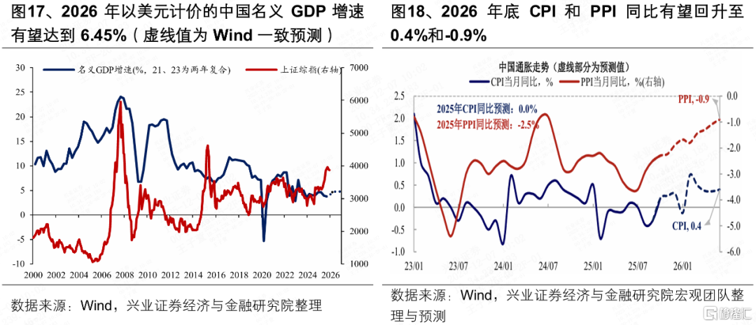 2026年,GDP平减指数和名义增长的修复方向均相对明确。参考IMF最新预测,2026年以美元计价的中国名义GDP增速有望达到6.45%,较2025年的3.46%明显抬升。而根据兴证宏观团队的估算,“反内卷”和其他呵护政策作用下,2026年通胀有望延续温和修复格局,至2026年底CPI和PPI同比有望回升至0.4%和-0.9%。按60%和40%的权重估算,则2026年GDP平减指数有望回升至-0.12%,较当前的-0.72%有望显著改善。
