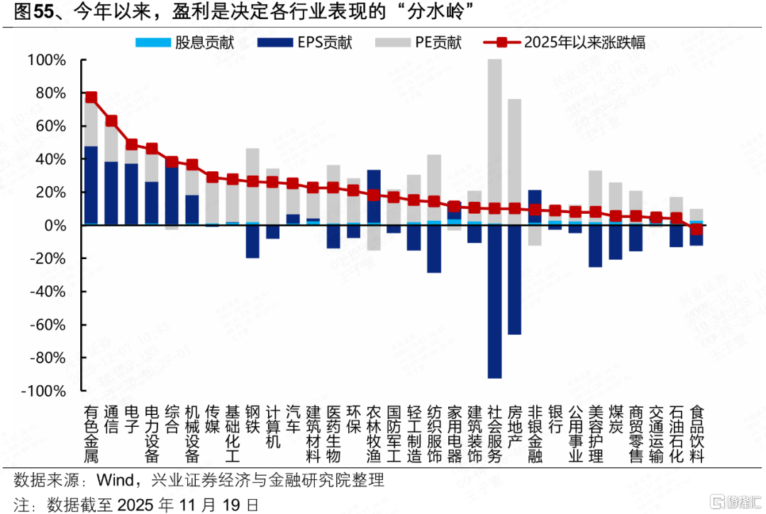 映射到资本市场上,今年以来盈利是决定各行业表现的“分水岭”,行业表现围绕景气展开了一场“淘汰赛”。今年大部分行业均在不同程度的“拔估值”,盈利成为最终决定各行业表现的“分水岭”。年初以来涨幅居前的有色、AI硬件、新能源、机械等,盈利贡献均占一半以上,而涨幅靠后的消费、地产链等,也基本上均由盈利拖累。因此,今年各行业表现的本质是围绕景气展开的一场“淘汰赛”。