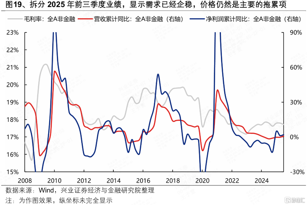 名义经济修复、价格回升有望支撑基本面进一步改善。对2025年前三季度的业绩进行拆分,作为更能反映真实需求的收入已经企稳向上,而全A非金融的毛利率仍在回落,表明价格仍然是盈利的主要拖累项。不过下半年以来,在“反内卷”政策的影响下,目前周期资源品的价格已经出现改善并带相关行业毛利率的改善。明年随着整体PPI的继续上行,全A非金融的毛利率也有望止跌企稳,并带动整体盈利回升。