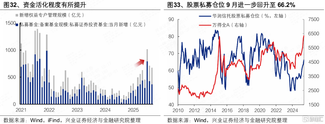 其中,以私募和专户为代表的高净值资金是今年市场重要的增量来源。今年以来,私募股票基金和权益专户的新发明显回暖,指向高净值人群资金已率先入市,结合仓位水平看后续有望提供更多增量。截至今年9月,私募基金累计新发规模超3400亿元,新发产品数量超9100只,权益专户累计新发规模接近1800亿元,新发数量超7600只,整体保持上行趋势,尤其是在4-5月新增备案规模明显扩大,指向高净值个人投资者已经通过私募&专户渠道率先入场。此外,私募股票基金仓位也持续回升,截至今年9月,整体仓位水平已升至66%,相较于2024年底部回升10pct,但距离历史高位仍有进一步提升空间。