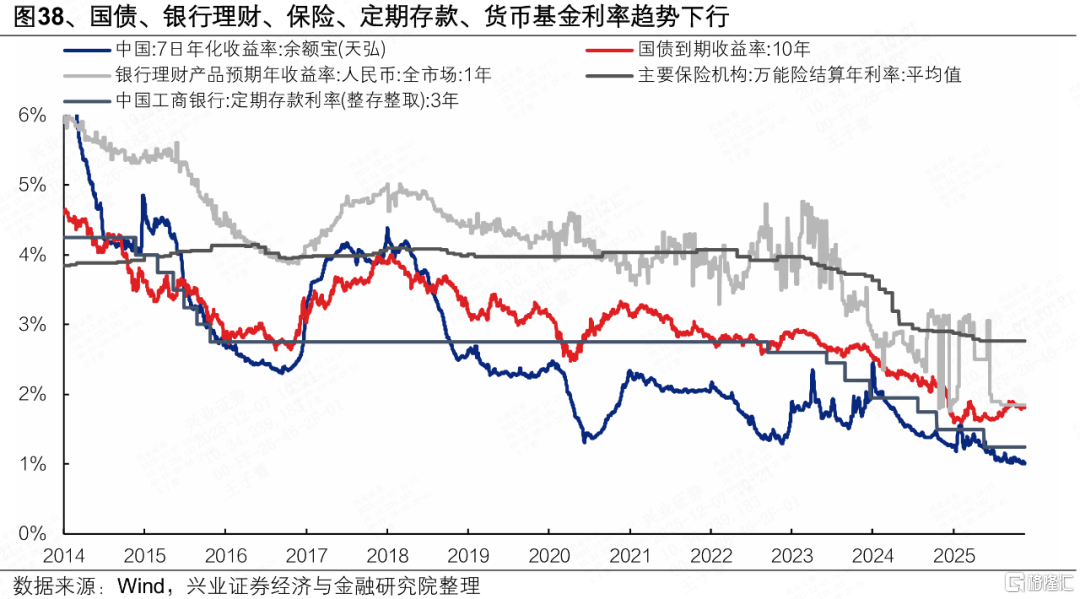 另一方面,本轮行情相较于过往牛市阶段不同的一点,便是当前的利率水平要远低于以往,资产荒更加严重,也会驱动居民资金“被动”增配权益。近两年广谱利率趋势下行,当前国债、银行理财预期收益率、保险预定利率、3年期定期存款、货币基金利率均降至2.8%以下,叠加楼市收益预期下降,史上最低的利率环境是驱动本轮居民财富向股市新一轮再配置的核心因素。