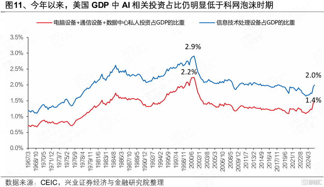 第三,从电脑设备+通信设备+数据中心投资和信息技术处理设备占美国GDP的比重来看,宏观层面上,尽管AI领域的资本开支显著飙升,但明显低于科网泡沫时期。