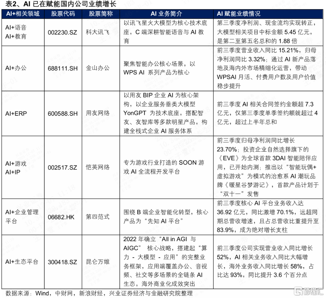 今年以来,AI已在赋能国内公司业绩增长,同样集中在办公、企业管理等To-B端领域,以及教育、语音、游戏等To-C端领域。