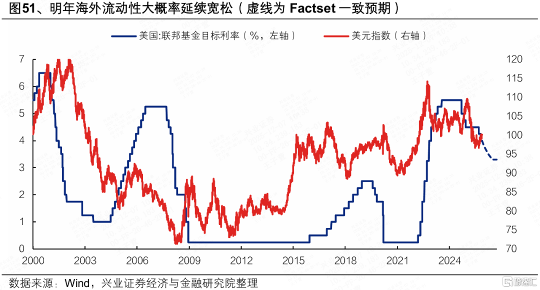 一方面,明年海外流动性大概率延续宽松,美元外溢效应可能推动外资向中国资产回流。美国货币政策受财政与AI“大而不能倒”双重压力裹挟,被迫宽松可能是大概率事件。